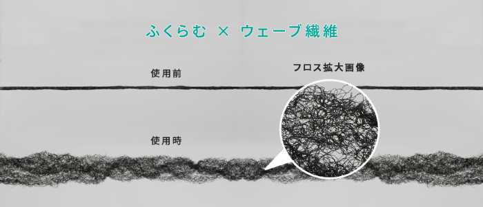 水に触れるとフロスがふんわりとふくらみ、独自開発のウェーブ繊維が歯ぐきの奥までやさしくフィット。