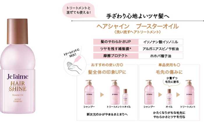 「ヘアシャイン ブースターオイル」は、イソノナン酸イソノニル配合で、洗い流した後もツヤとまとまりが続く実力派。トリートメントに混ぜて使えば、サロン級の仕上がりに。