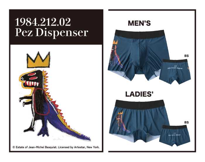 バスキアの多彩な作品の中から、象徴的な6種類の名画をセレクト。ストリートカルチャーと知的センスを併せ持つ彼のアートは、ボクサーパンツという新たなキャンバスで息を吹き返しました。