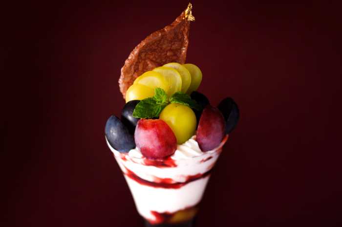 葡萄とカシスのムースにプルーンジャムを重ねた、見た目も華やかな逸品。パフェに加え、月替わりの特別デザートもラインナップ。