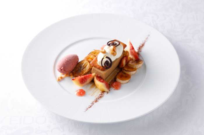 岡山県産希少バナナ“ドレーヌ”とコーヒークレーム 無花果のソルベ添え