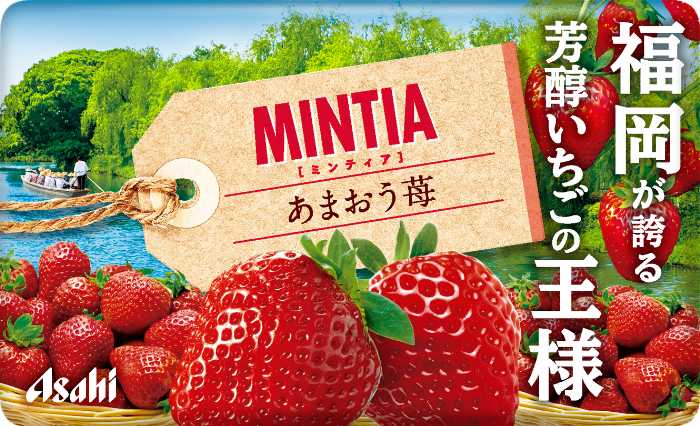 まるで福岡で苺狩りをしている気分に♡『ミンティア あまおう苺』は、福岡県産のあまおう果汁を使用し、甘味と酸味の絶妙なバランスが楽しめる一粒。