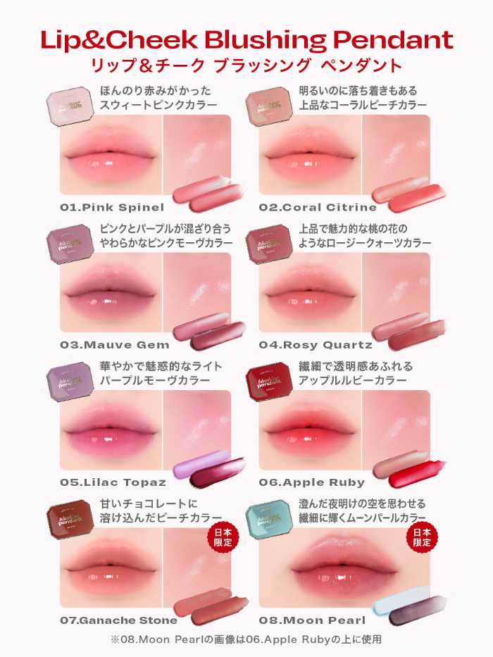 リップ&チーク兼用の2WAY仕様。8色展開(うち2色は日本限定色)で、ピンクスピネルやムーンパールなど個性的な名前と繊細な色合いが魅力です。