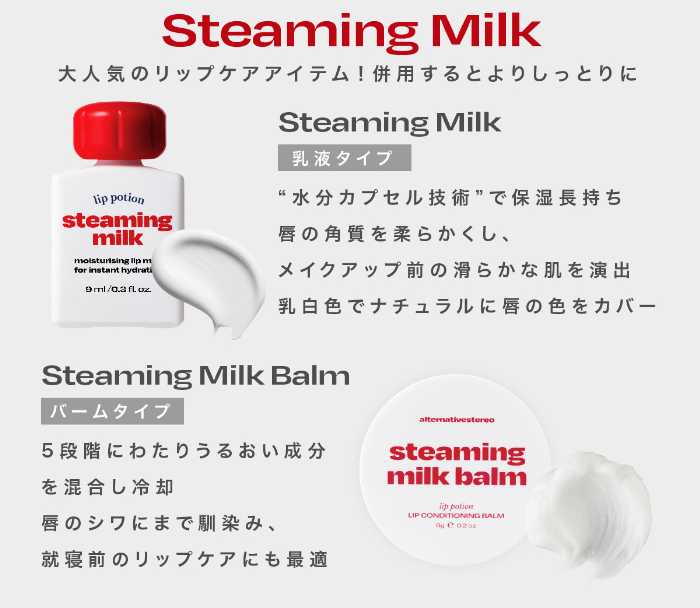 ミルクのような乳液タイプ&バームタイプのリップ。なめらかにのびて、しっとり感が持続します。