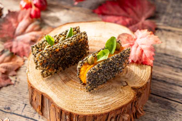 「ゴマとカボチャのもなかベーコンジャム」や「さつまいもみたらし団子」、「サーモンとりんごのディルビーツコーン」など、和洋のエッセンスが交差する独創的なひと皿たち。