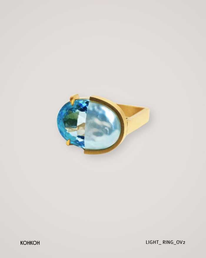 KOHKOHを象徴する「Light」シリーズに、新たなデザインが仲間入り。透明感のあるブルートパーズとホワイトトパーズの上に真珠をあしらったリングは、まるで光を包み込むような幻想的な佇まいです。