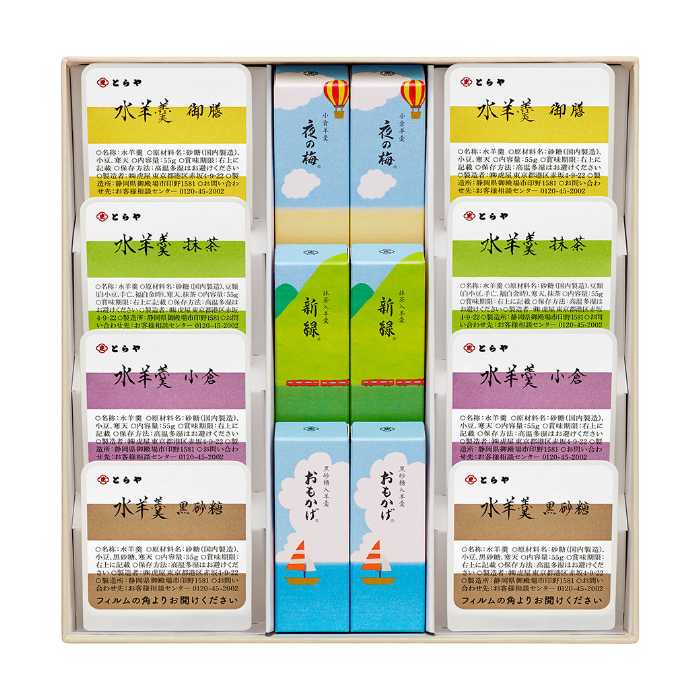 内容:夏パッケージ小形羊羹「夜の梅」「おもかげ」「新緑」各2点/水羊羹「御膳(こし餡)」「小倉」「抹茶」「黒砂糖」各2点