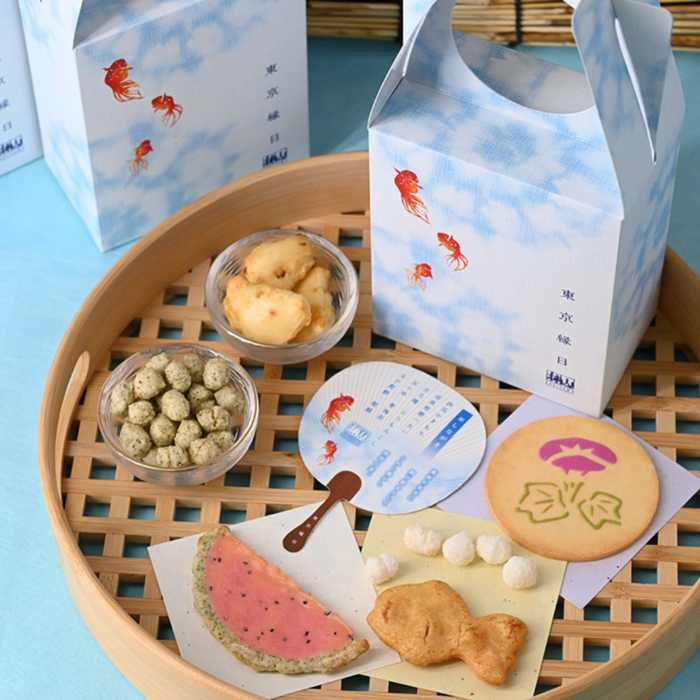 赤坂柿山の「東京縁日」は、金魚やスイカのモチーフを使ったあられが、涼しげな手桶型の箱に詰められた可愛らしい一品。
