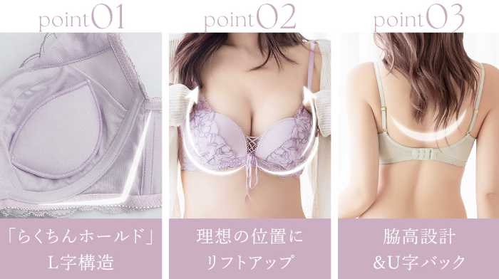 Leeneシリーズ最大の魅力は、ノンワイヤーでもしっかりホールドしてくれる「らくちんホールド」設計。L字構造でバストを内側に寄せ、自然で美しい谷間をメイクします。