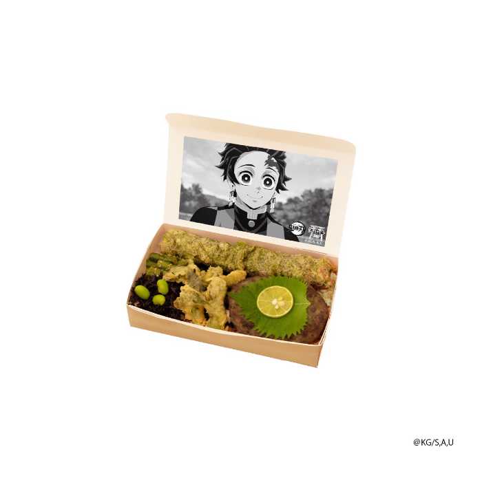 さらに、炭治郎の好物「タラの芽の天ぷら」、海苔二倍の竹輪磯辺揚げ、半熟卵、インゲンの胡麻和え、ひじき枝豆など、和の味わいが詰まった一品です。