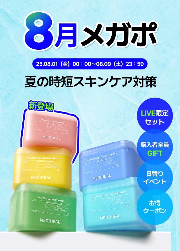 2025年8月1日(金)〜9日(土)の9日間限定で開催される、Qoo10「夏の時短スキンケア対策」メガポにて、メディヒールの新商品が日本で初お披露目されます。