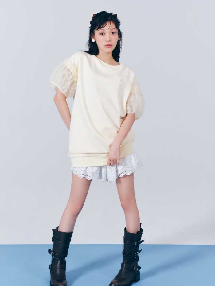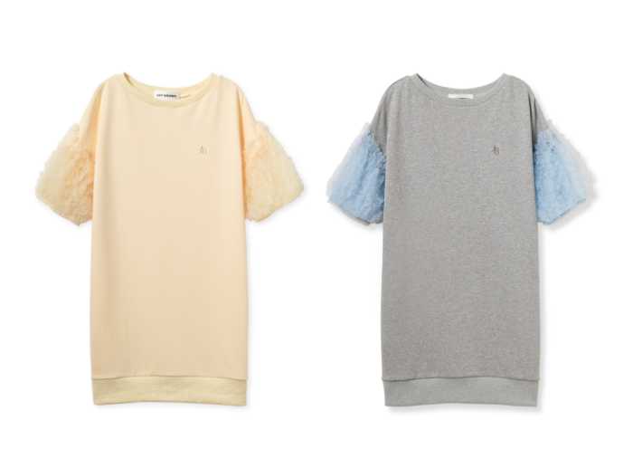 カジュアルな中にも女性らしさを演出する「ミニフリルスウェットワンピース」。ボリュームチュールの袖がアクセントになり、1枚でワンピとしても、トップスとしても着まわせる万能アイテムです。