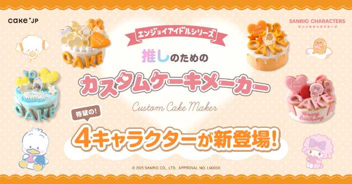 SNSでも話題の“推し活スイーツ”が、さらに可愛くパワーアップ♡ケーキ専門通販サイト「Cake.jp」の人気シリーズ「推しのためのカスタムケーキメーカー」に、サンリオの人気キャラクター「あひるのペックル」「ぐでたま」「マイスウィートピアノ」「こぎみゅん」が新登場!世界にひとつ、自分だけの“推しケーキ”を作って、大切な推しや記念日をもっと特別に彩ってみませんか?