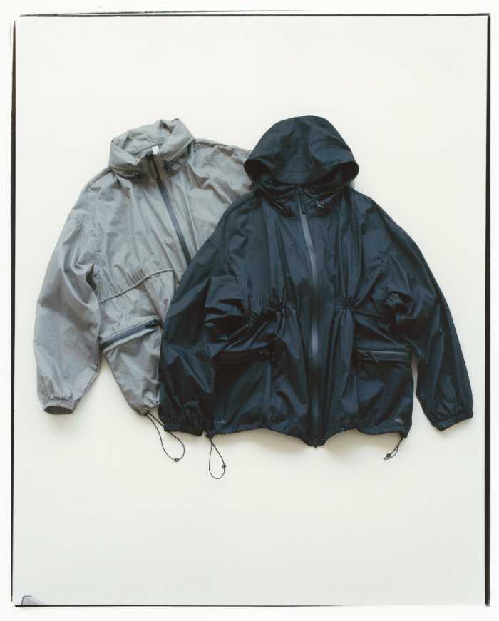 フードの出し入れやウエストの調整も可能で、パッカブル仕様だから旅行やアウトドアでも活躍します。カラーはGRYとBLK、サイズはMのワンサイズ展開。