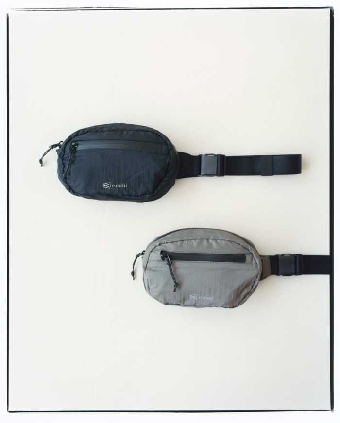 バッグ派にも注目のEMMI RECYCLED NYLON PACKABLE HIP BAG(7,150円)は、ストラップの収納やカラビナ付きの仕様など、アウトドアでの利便性にこだわった設計。