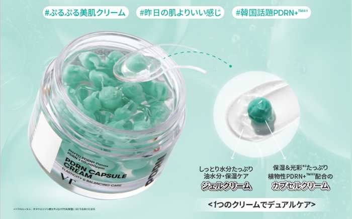 “昨日の肌より、なんだかいい感じ”を叶えると話題の韓国スキンケアがついに日本上陸。VT COSMETICSから登場した『PDRN+ カプセルクリーム100』は、みずみずしいジェルと弾けるカプセルの〈デュアルテクスチャー〉が魅力♡うるおい・ハリ・光彩※2をまとめてケアできる注目の一品です。VTのPDRN+シリーズで、ぷるぷる&輝く美肌ルーティンを始めてみませんか?