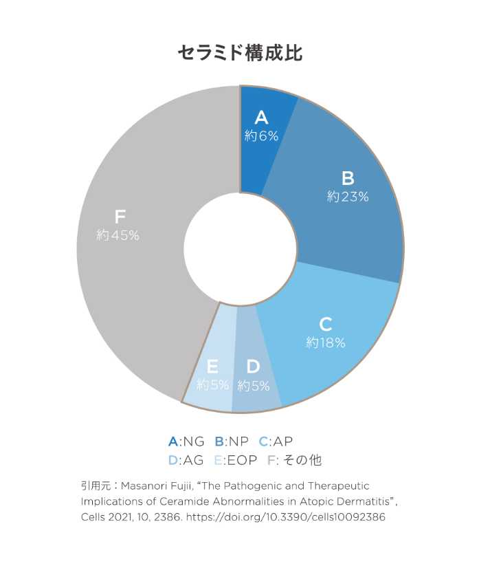 肌に存在するセラミドと同じ構造を持つヒト型セラミド(セラミドAG、AP、EOP、NG、NP)を5種バランスよく配合。