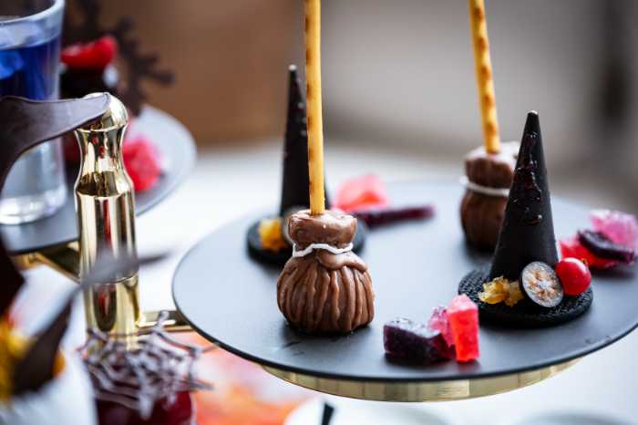 ドクロ(カラベラ)が浮かぶゼリー、クモの巣模様のムース、魔女のホウキ型ショコラなど、遊び心満載のスイーツが勢揃い。