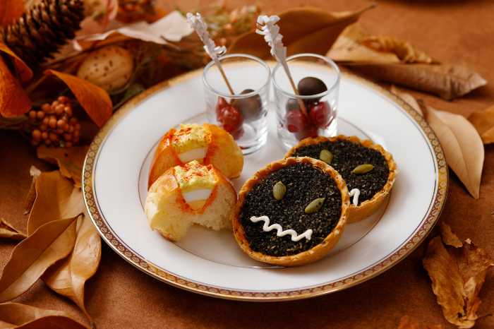 セイボリーには、ジャック・オー・ランタンの顔をかたどったタルトや、デビルエッグサンドなど、ユニークでちょっぴりスパイシーなメニューがラインアップ。