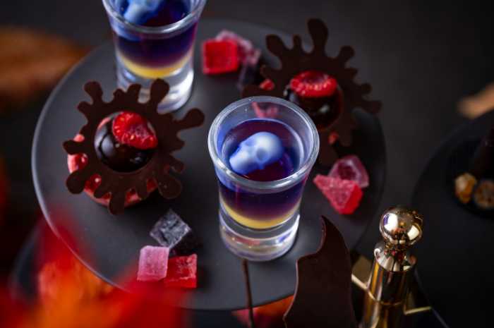 ドクロ(カラベラ)ゼリーやクモの巣を描いたスパイダームース、魔女の帽子をかたどったウィッチハットムース、ホウキショコラなど、遊び心満点。