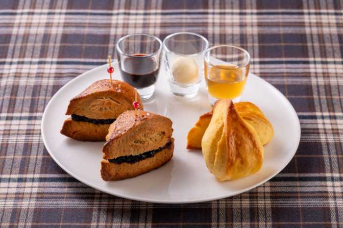 スコーンは全粒粉とプレーンの2種類で、カレンズジャムや赤ワイン&バルサミコ酢のジャムとともに楽しめます。