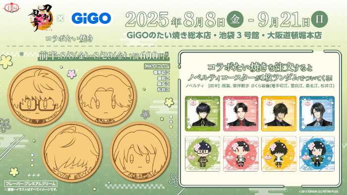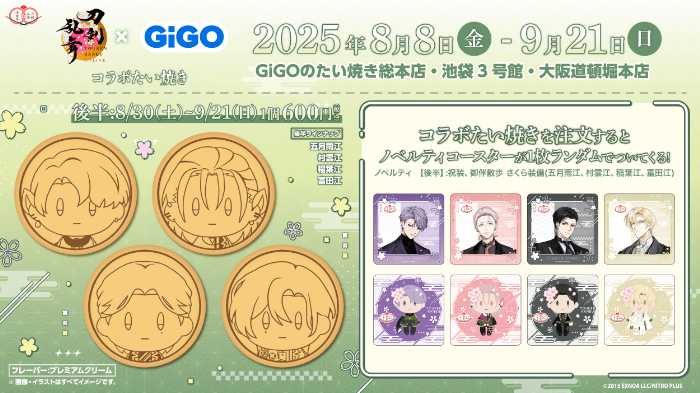 2025年の夏を彩る、刀剣乱舞ONLINE×GiGOの夢のコラボ。たい焼きは推しの絵柄でランダムに登場し、ドリンクにも同柄のノベルティがついてきます。