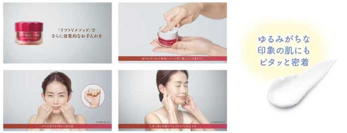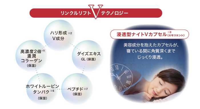 リンクルリフトVテクノロジーでピタッと密着し、時間差でじっくり届く浸透型ナイトVカプセルも配合。