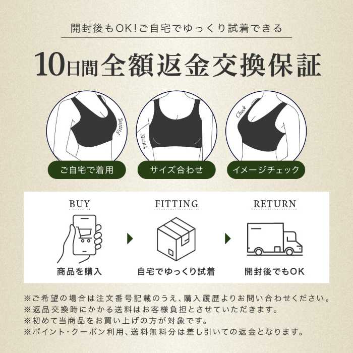 「ナイトブラって本当に自分に合うの?」そんな不安を感じている方にもうれしいのが、10日間の全額返金・交換保証。開封後でもOKなので、実際に着けて試すことができます。