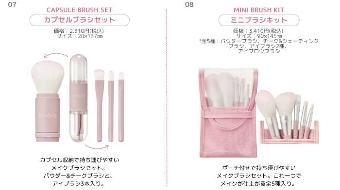 持ち運びに便利なミニブラシキットや、見た目もキュートなカプセルブラシキットは、旅行やお出かけにぴったり!コンパクトながら実用性も高く、いつものポーチにもすっきり収まります。