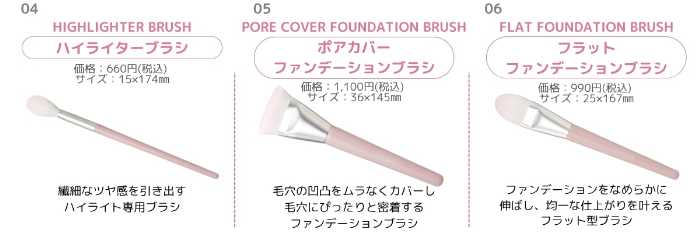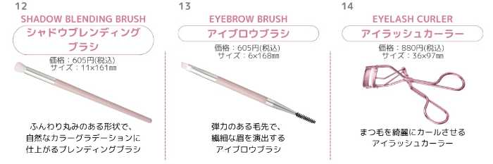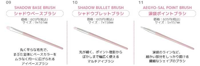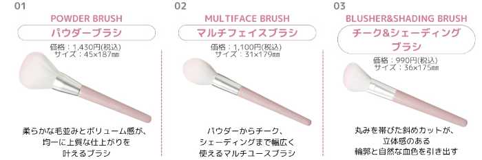 パウダーブラシやチークブラシ、アイシャドウブラシなど、フルラインで揃うフェイス用ブラシをはじめ、眉メイクに欠かせないアイブロウブラシやスクリューブラシなど、日常のメイクに役立つアイテムが勢ぞろい。
