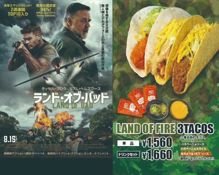 8月7日(木)から31日(日)までの期間限定で登場する「LAND OF FIRE 3TACOS」は、映画『ランド・オブ・バッド』とのコラボレーションメニュー。