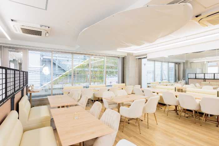 店内は白を基調とした爽やかで落ち着いた空間。40席以上のゆったりとしたレイアウトで、暑さを忘れる心地よいひとときを演出してくれます。