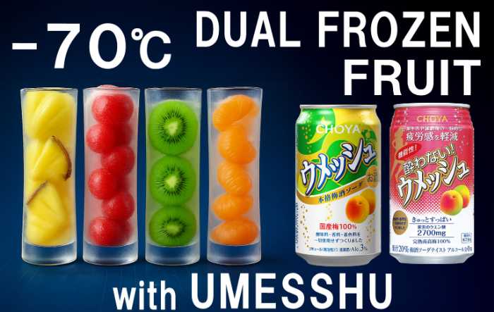 注目は、特許出願中の技術で誕生した「-70℃ DUAL FROZEN FRUIT」。フルーツの中に梅酒をしっかり染み込ませ、まるで梅酒そのものを味わうような濃厚さが特徴です。