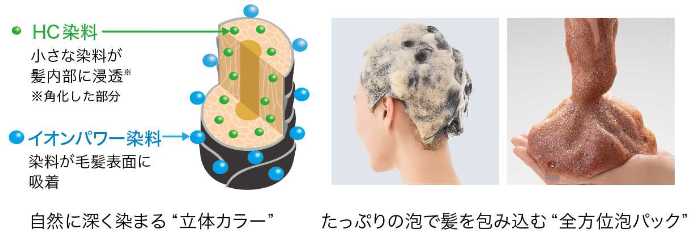 LPLPカラーシャンプー最大の魅力は、360°全方位泡パック。きめ細かな泡が髪全体を包み込み、白髪をムラなく自然に染め上げます。