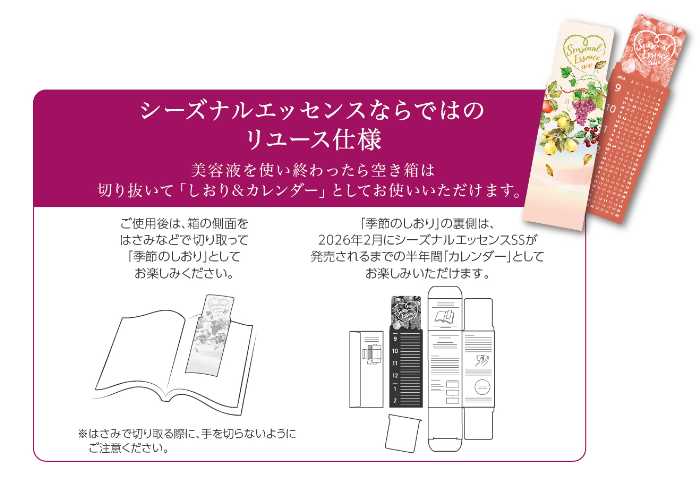 空き箱は“しおり&カレンダー”としてリユースできる仕掛けも嬉しいポイントです。使うたびに気分が高まる、季節感たっぷりの美容液で、肌も気持ちも秋仕様に整えましょう♪