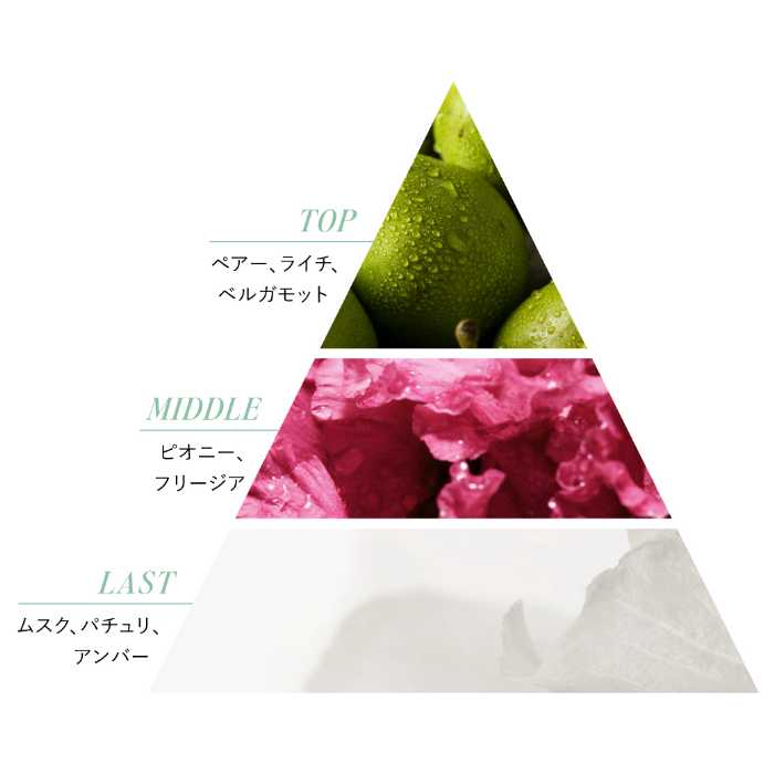 フレッシュなペアーとライチ、やわらかなピオニーとアンバーが重なるフルーティーフローラルの香りは、性別を問わず好まれる軽やかさ。