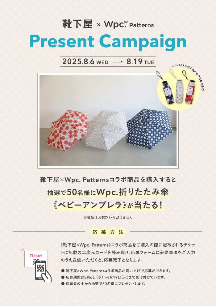 靴下屋店舗またはTabio公式オンラインストアにてコラボ商品を購入すると、抽選で50名様にWpc.の折りたたみ傘“ベビーアンブレラ”が当たるキャンペーンを実施中。