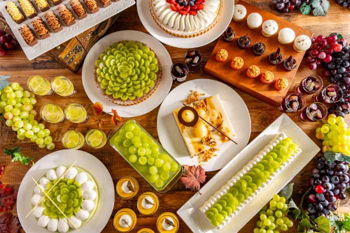 週末15:30~17:00には「シャインマスカットスイーツビュッフェ」(9/6〜11/16)も開催♡セイボリーも並ぶバランスのよい内容で、大人3,500円と嬉しい価格です。