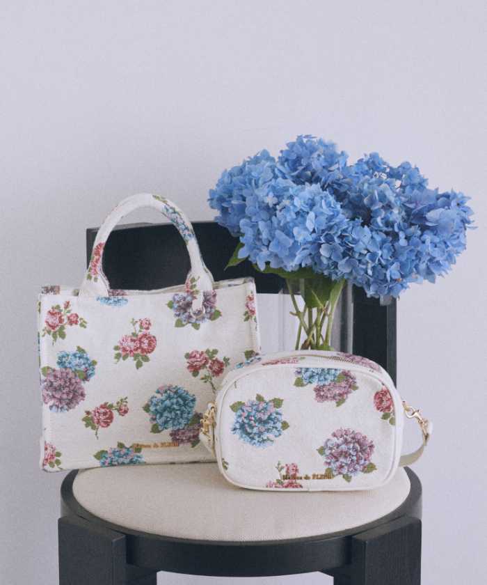 まず注目は、日比谷花壇監修のコラボアイテム。バラとアジサイをモチーフにしたデザインを、フランスのゴブラン織りメーカー「ART DE LYS」の上質なテキスタイルで仕立てた特別なバッグです。
