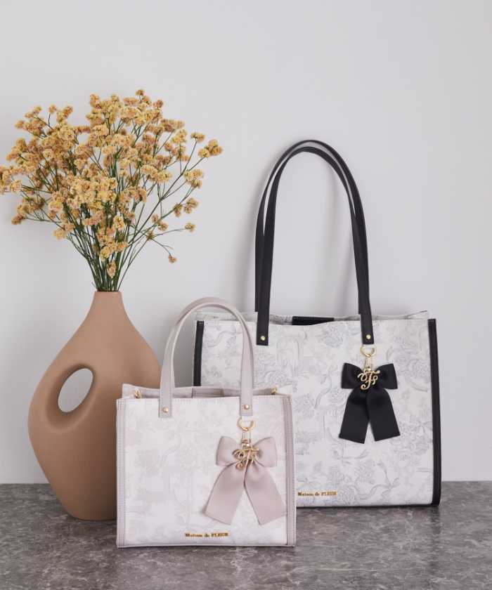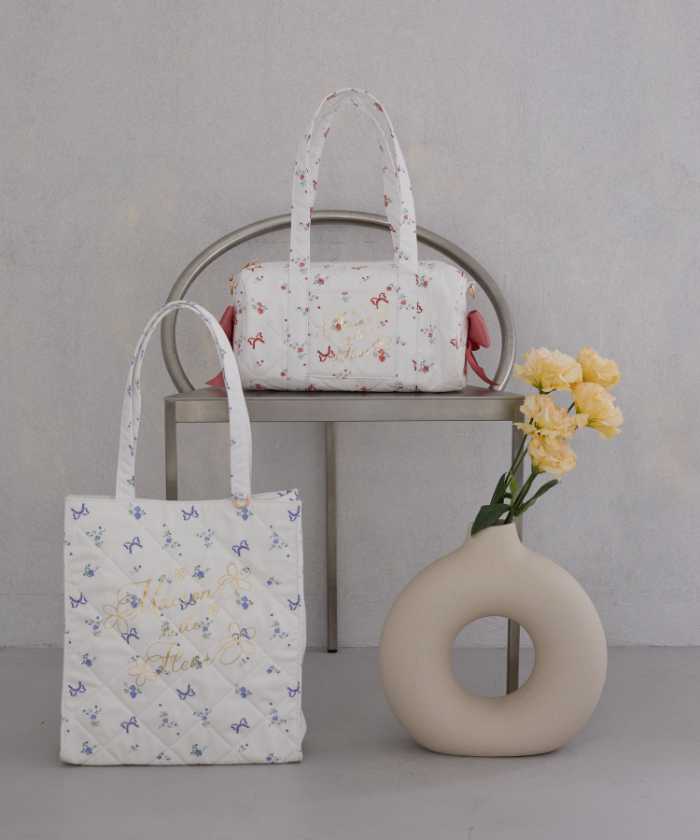 さらに、可憐な小花とリボンが描かれたオリジナルプリントのバッグシリーズは、キルティング仕様がフェミニンな印象。どれも季節の装いにぴったりな、花の記憶を閉じ込めた一品です。