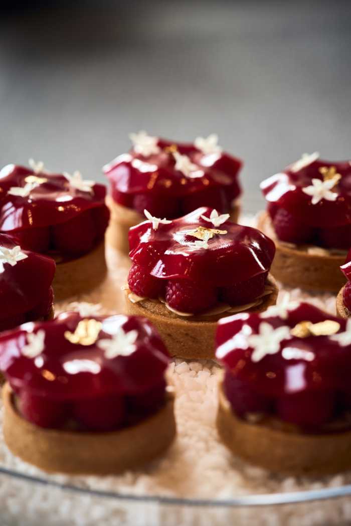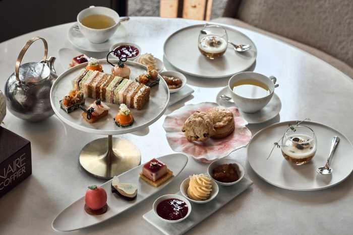 セイボリーは「赤パプリカのムース」「鴨のコンフィ」など4種、サンドウイッチは3種、そしてスイーツ8種や焼きたてスコーン2種も。