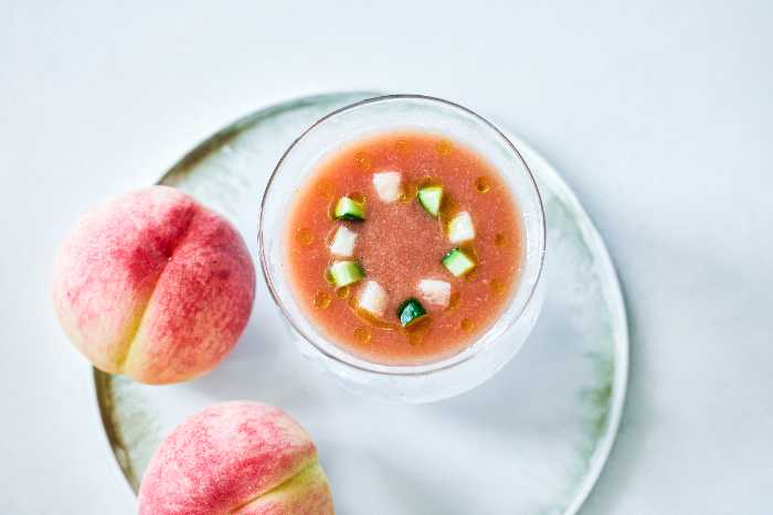 ・国産白桃ガスパチョ(2,200円):桃の甘みと爽やかさがマッチする冷製スープ。