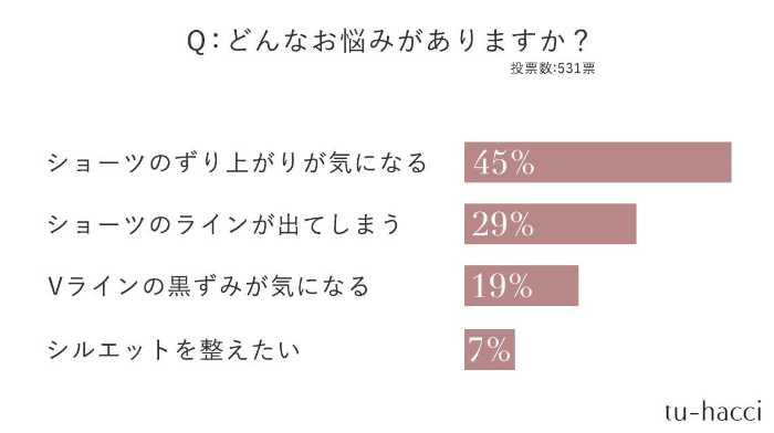 その中でも特に多かったのが、「ずり上がる」「ラインが出る」「Vラインの黒ずみ」「シルエットを整えたい」といった悩み。