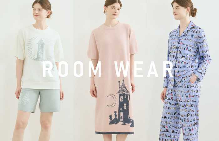 コレクションの目玉ともいえるルームウェアシリーズには、《なめらかふわふわプルオーバー&ハーフパンツセット》(M-L・13,200円)、《ワンピース》(M-L・9,900円)、《フルジップパーカー》(M-L・11,000円)が揃います。