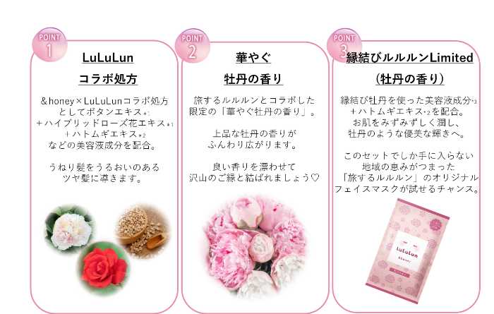 アンドハニー メルティ ルルルン モイストリペア ペアセット(3,080円・税込)は、シャンプー(440mL)とヘアトリートメント(445g)に、牡丹の香りの縁結びルルルンフェイスマスク(1袋・30mL)をセットにした豪華仕様。