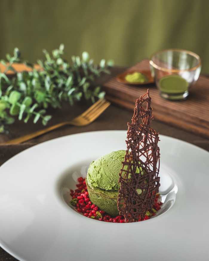 ふわふわのエスプーマや抹茶アイスとともに楽しめます。次に「バニラビーンズフォンダンショコラ -宇治抹茶-」(単品1,210円税込)は、濃厚な抹茶アイスと温かなフォンダンショコラが絶妙なハーモニー。