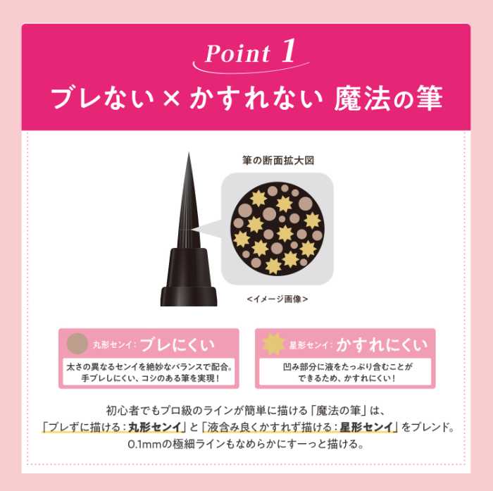 キングダム リキッドアイライナーTPの最大の魅力は、ブレずに描ける「丸形センイ」と、かすれにくい「星形センイ」をブレンドした“魔法の筆”。