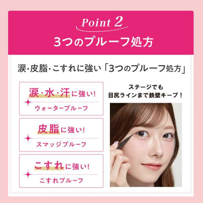 汗や涙に強いウォータープルーフ、皮脂に負けないスマッジプルーフ、そしてこすれに強いこすれプルーフの3重構え。