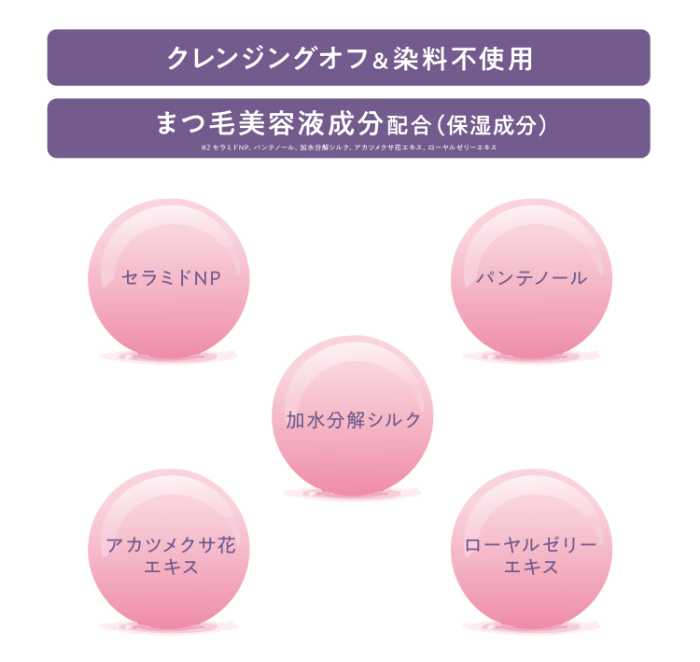 さらに染料不使用で簡単オフ可能。まつ毛美容液成分(セラミドNP、パンテノール、加水分解シルクほか)配合で、まつ毛ケアも同時に叶います。