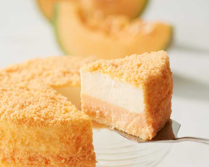 この時期だけの特別な味わい「メロンドゥーブル ~北海道メロン~」(2,376円/約12cm)は、上層に北海道産生クリームとマスカルポーネのレアチーズ、下層には赤肉メロンピューレ入りベイクドチーズを重ねた逸品。